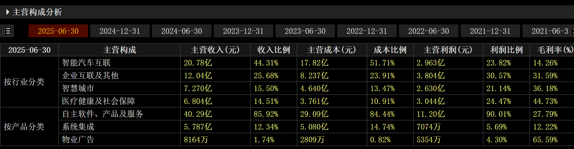 尽管按业务板块永别出“智能汽车互联”“企业互联特别他”“灵巧城市”“医疗健康及社会保险”等前沿畛域,2025年上半年这些板块的毛利率(智能汽车互联14.26%、企业互联特别他31.59%、灵巧城市36.18%、医疗健康及社会保险44.73%)远低于行业均值,标明其实质仍以低附加值的系统集成模式为主。