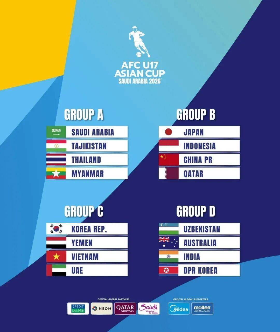 2026亚足联U17亚洲杯将于当地工夫5月5日至22日在沙特阿拉伯举行,通盘16支参赛球队被分为4个小组,每个小组前2名将取得八强席位,并平直锁定2026国外足联U-17寰宇杯的参赛经验。